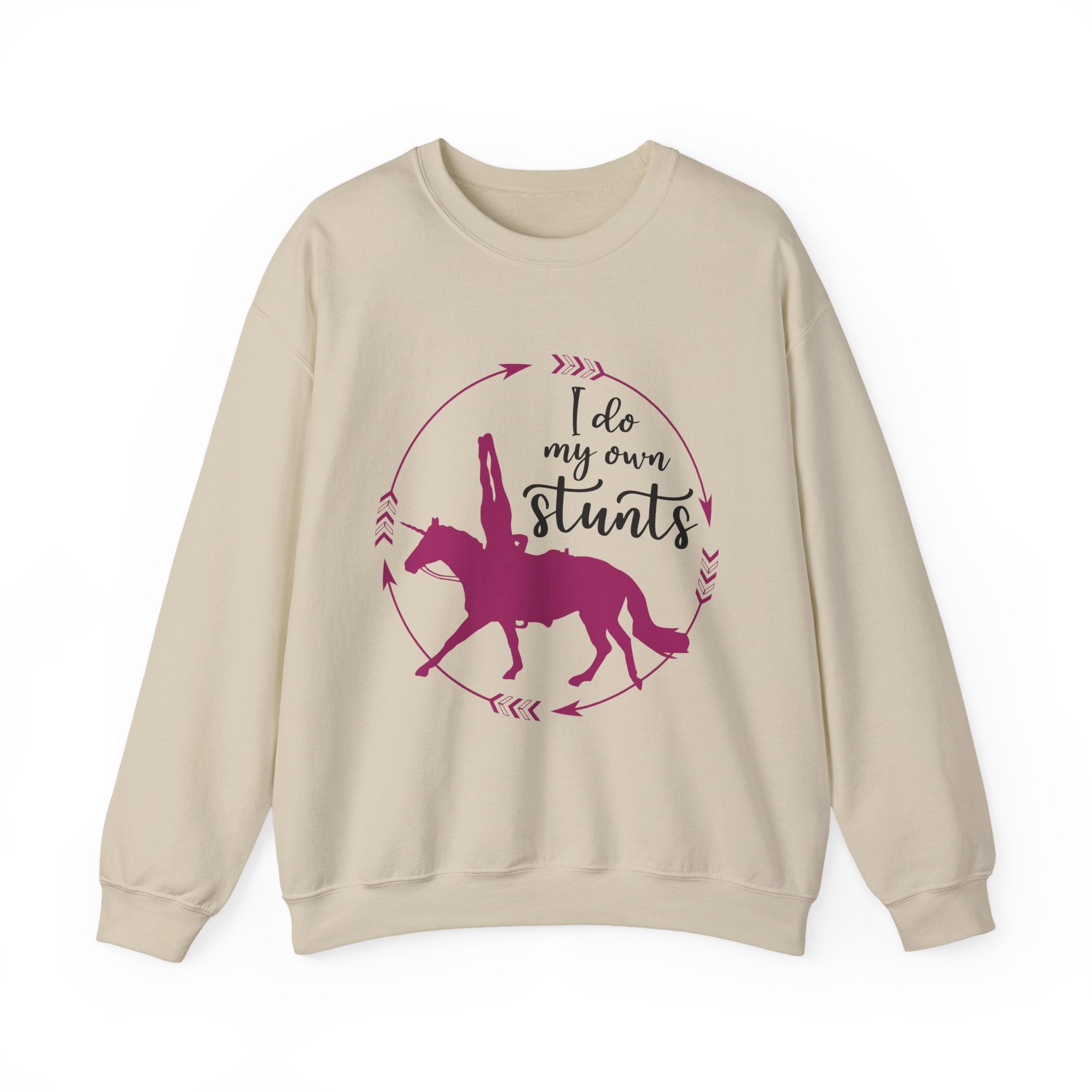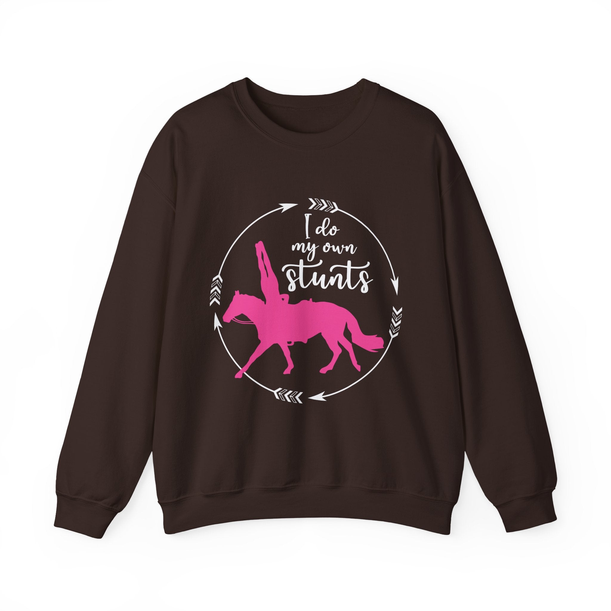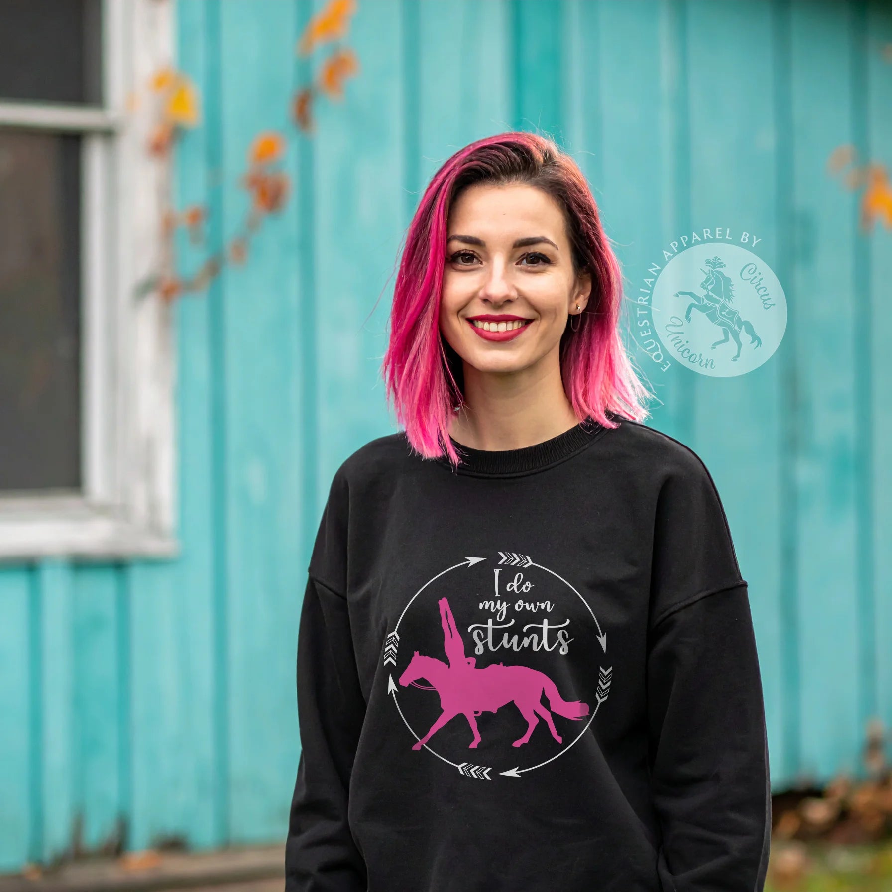 Bring bold trick-riding energy to your everyday barn routine with the “I Do My Own Stunts” Trick Rider Sweatshirt. Designed for horse lovers who live a little wild, this cozy crewneck pairs a soft feel with durable construction—perfect for chilly mornings at the barn, weekend rodeos, or relaxing after a long ride.