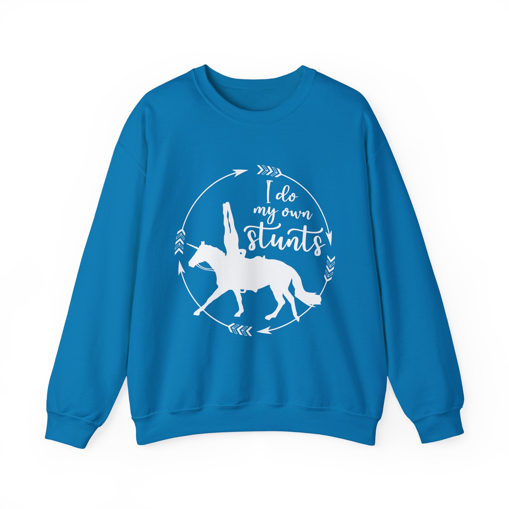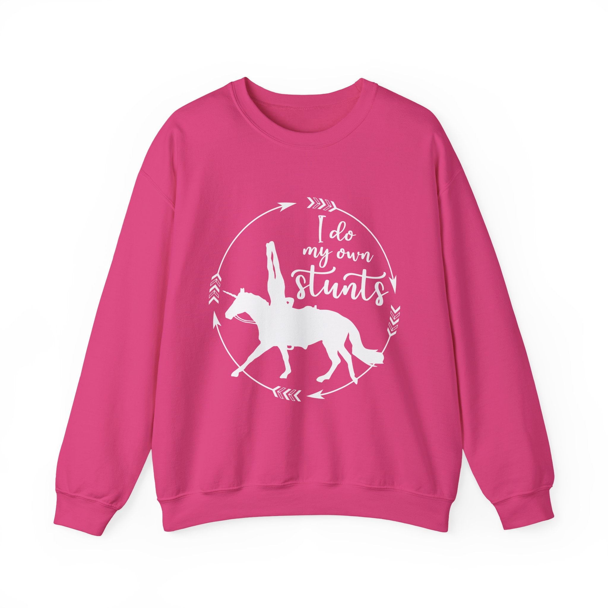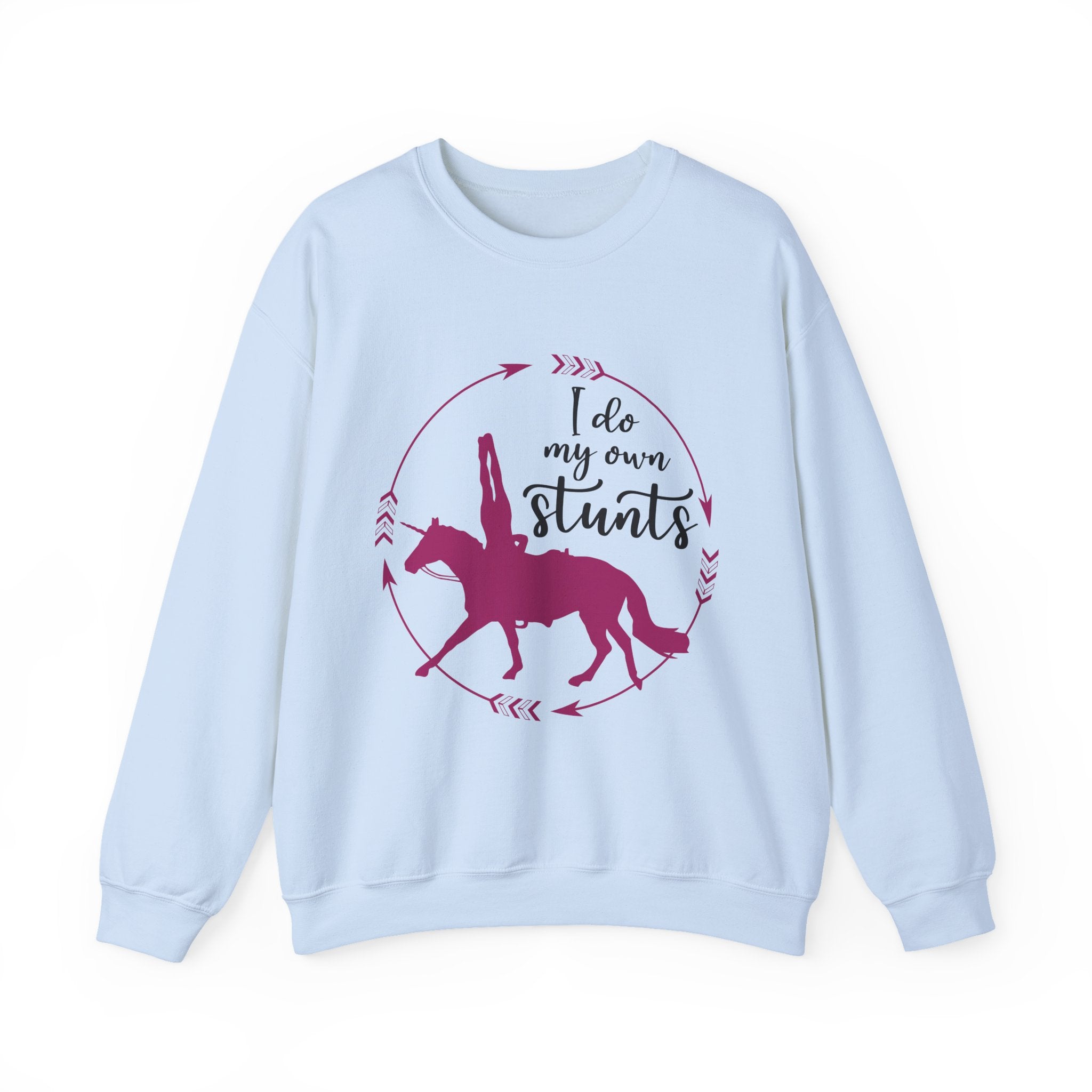 Bring bold trick-riding energy to your everyday barn routine with the “I Do My Own Stunts” Trick Rider Sweatshirt. Designed for horse lovers who live a little wild, this cozy crewneck pairs a soft feel with durable construction—perfect for chilly mornings at the barn, weekend rodeos, or relaxing after a long ride.