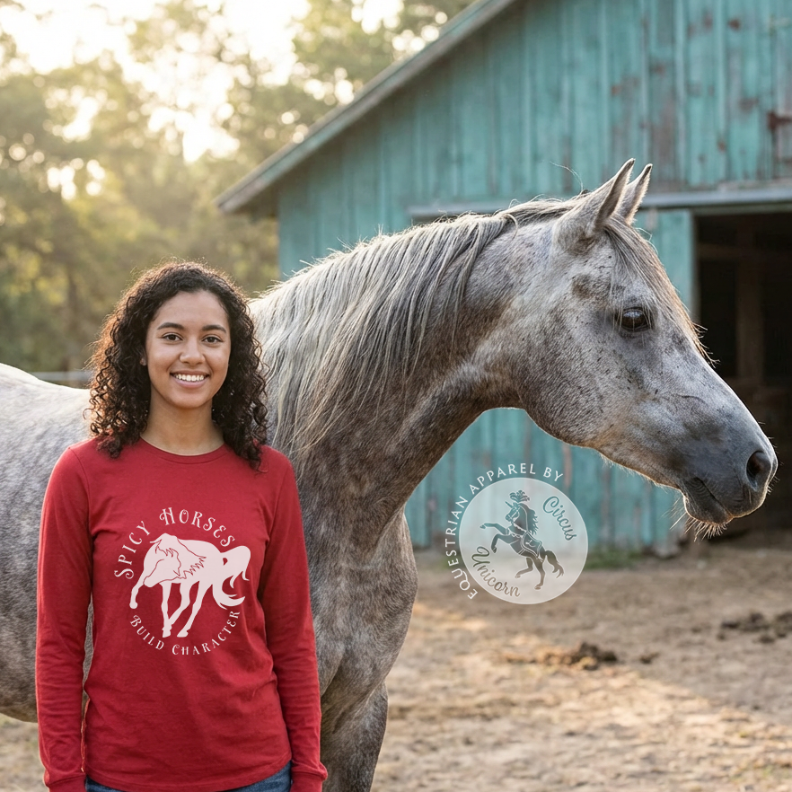 - Professionally printed frolicking horse graphic with “Spicy Horses Build Character” text