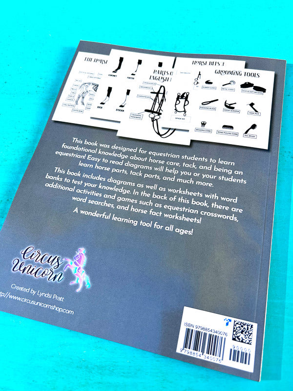 This book was designed for equestrian students to learn foundational knowledge about horse care, tack, and being an equestrian! Easy to read diagrams will help you or your students learn horse parts, tack parts, and much more.