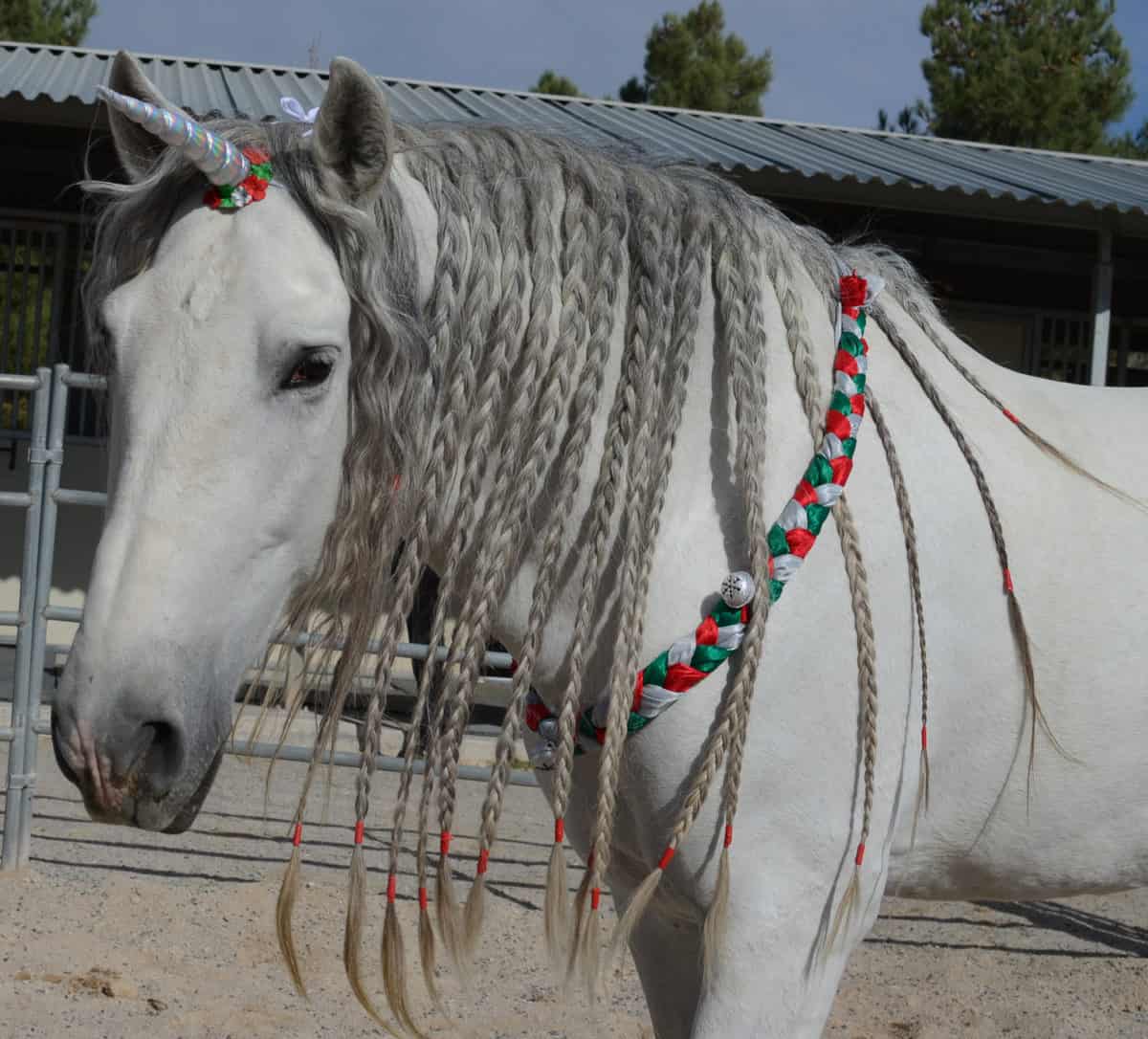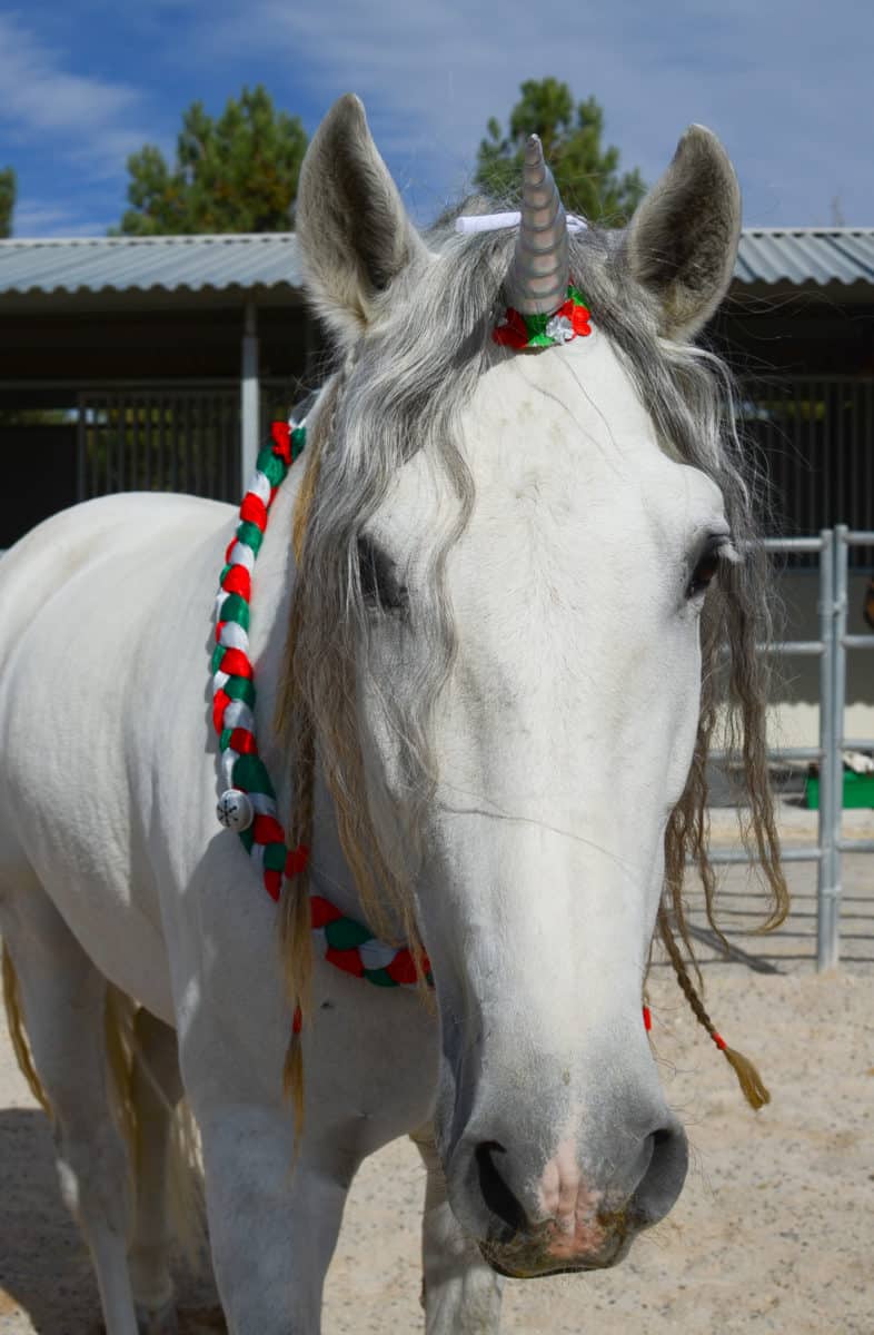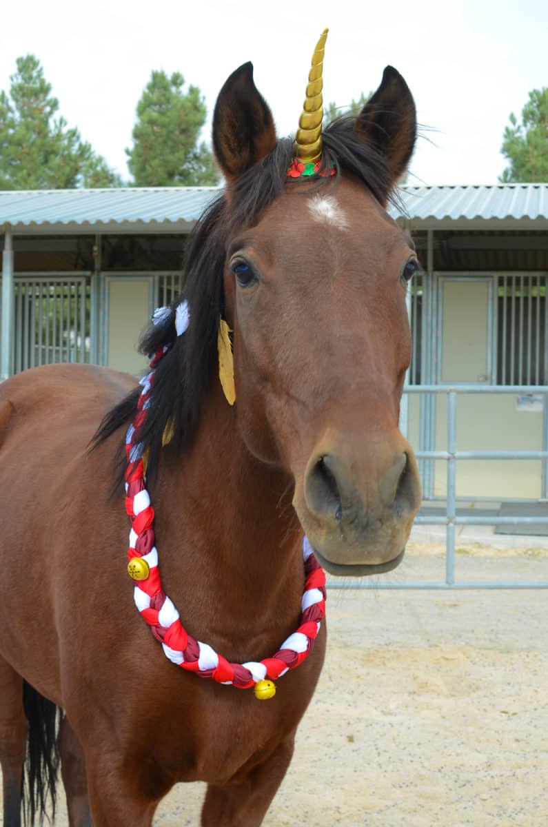 Christmas Neck Wreath for horses and ponies - made of braided shiny fabric and festive jingle bells. Fabric is sourced from recycled aerial silks!