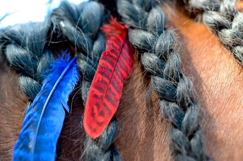 This listing is for a SET OF 6 FEATHERS - 3 red and 3 blue. Mane Feathers for horses and ponies can clip into the mane and tail.