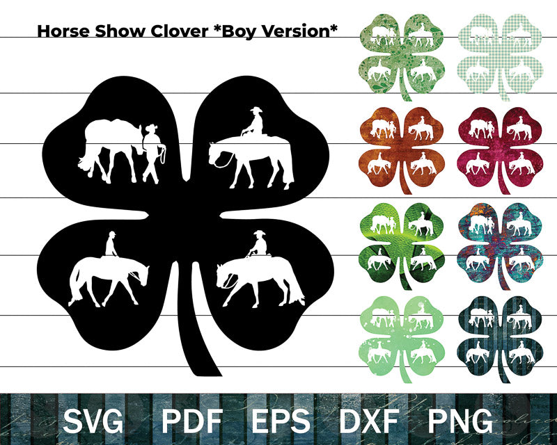 High quality vector 4-H clover horse graphics - great for 4H club crafts, shirt designs, and projects. Includes 12 PNG color variations.