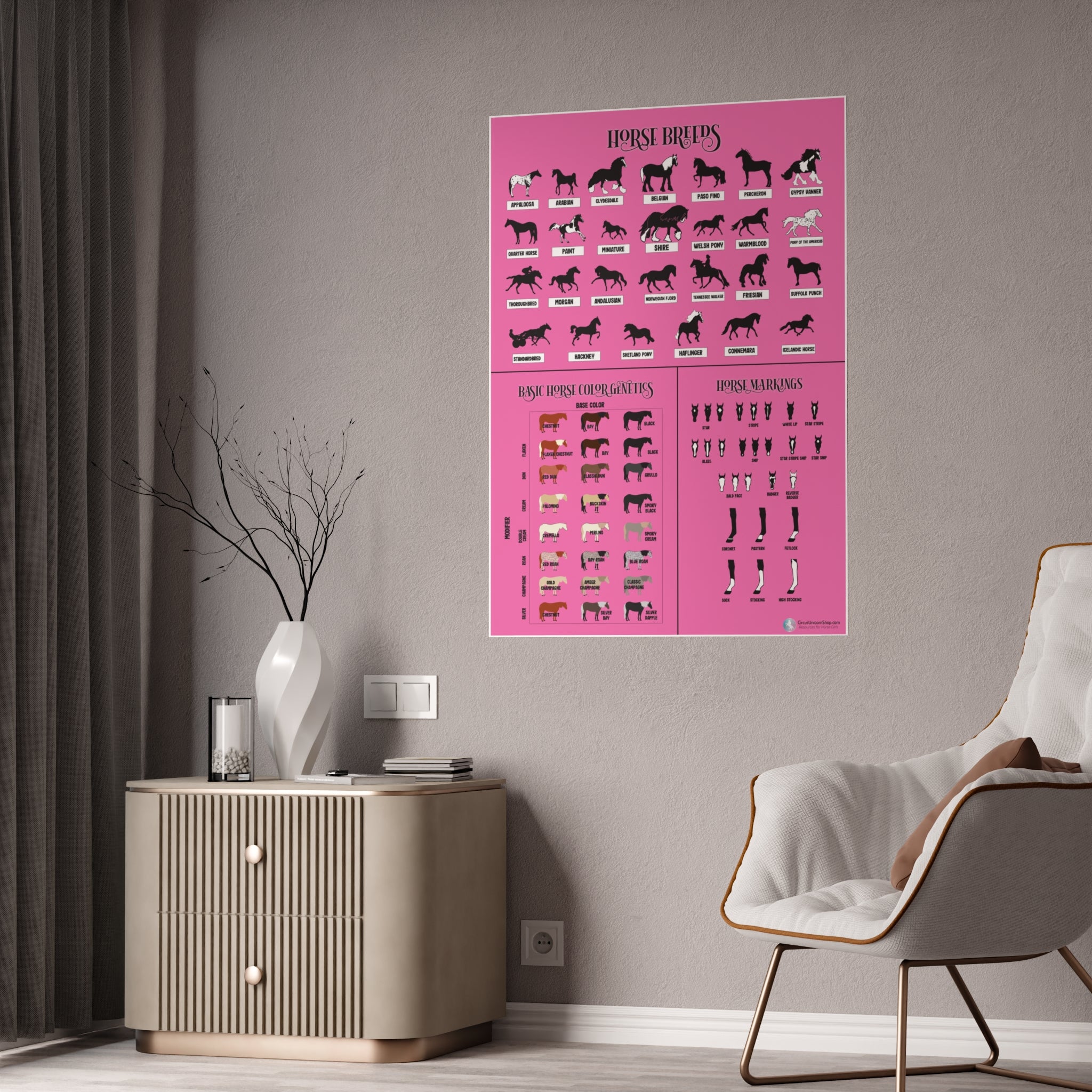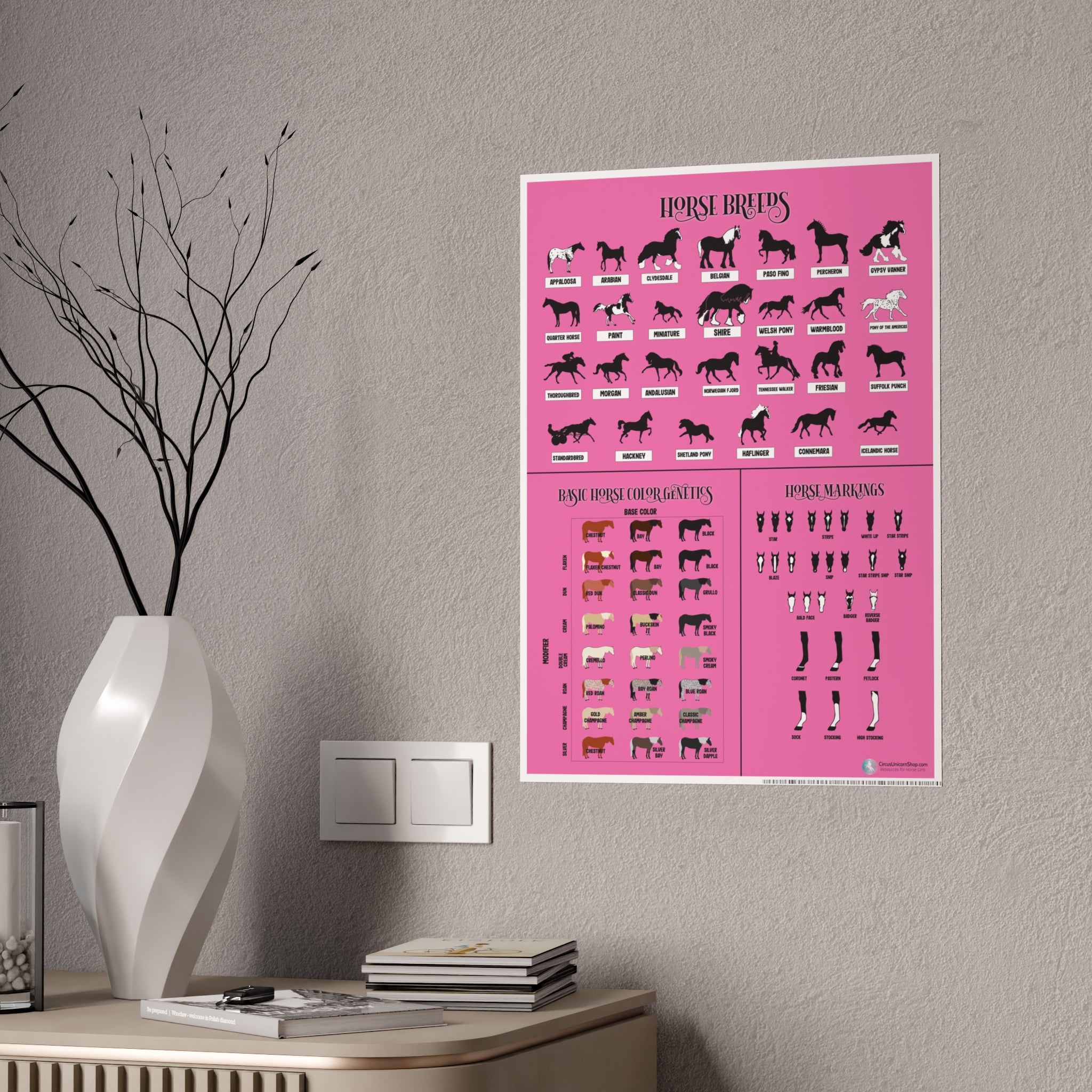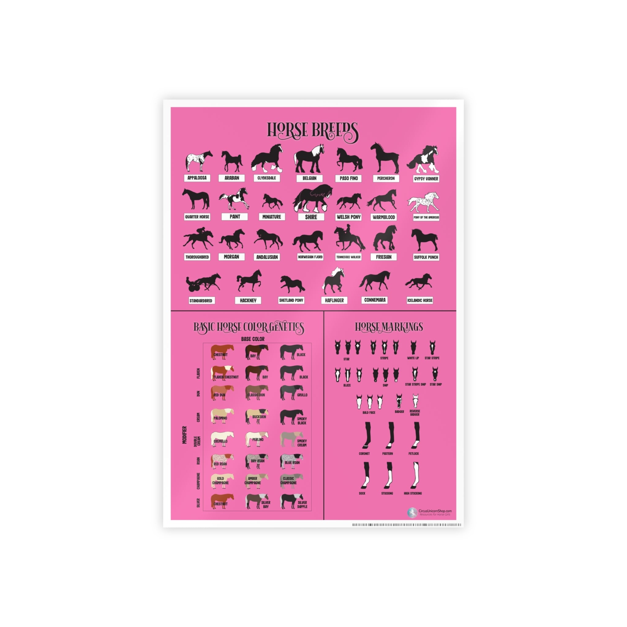 This fun PINK equestrian poster is a wonderful wall-hanger for your barn or office! It also makes a great gift for horseback riding students, horse crazy kids, and horse owners! Includes 27 Horse Breeds, Basic Horse Color Genetics (with base colors and modifiers), and Face & Leg Markings!