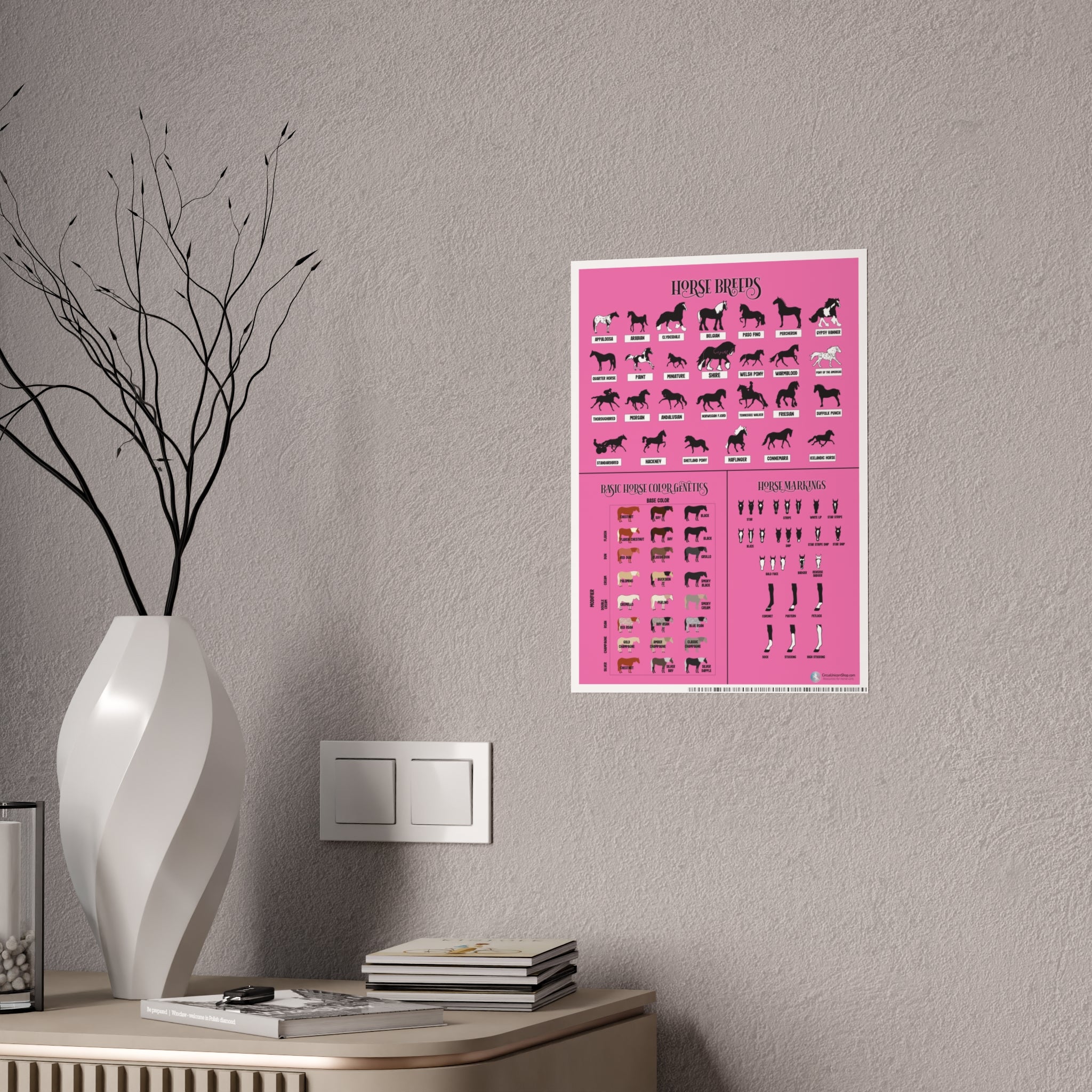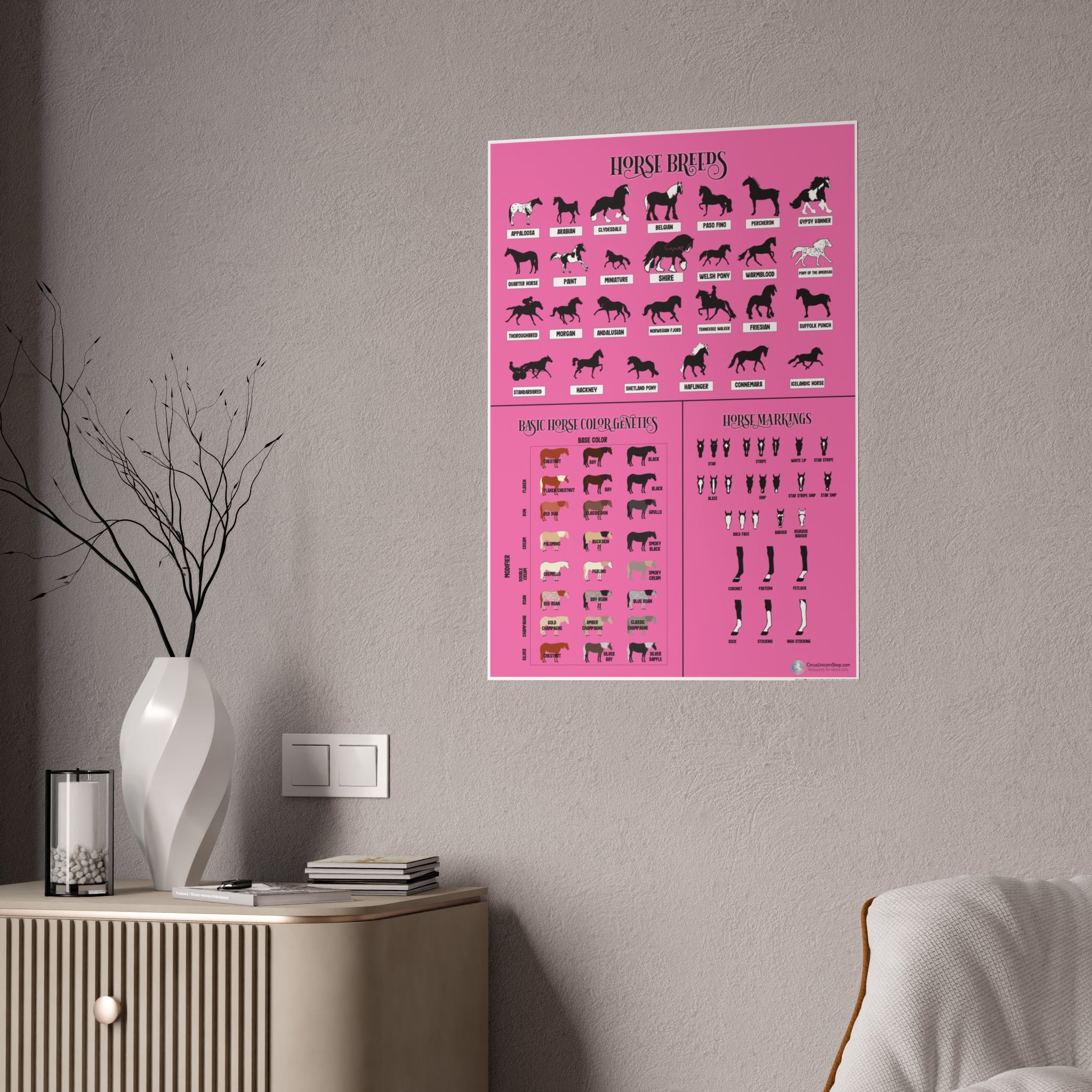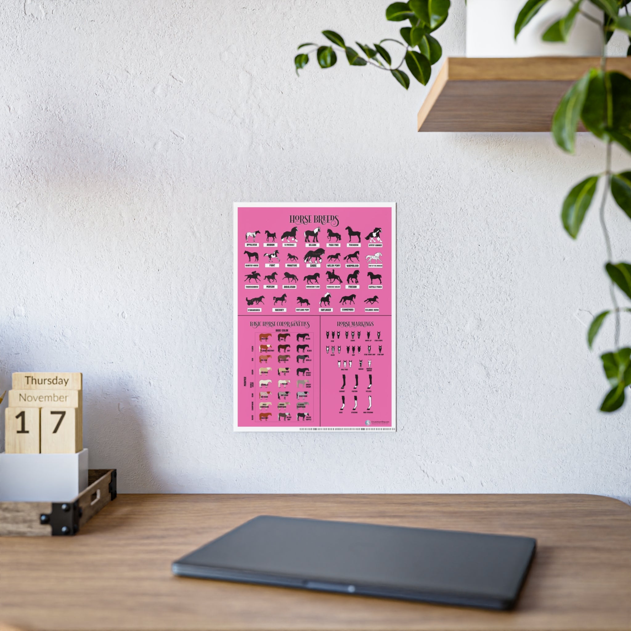 This fun PINK equestrian poster is a wonderful wall-hanger for your barn or office! It also makes a great gift for horseback riding students, horse crazy kids, and horse owners! Includes 27 Horse Breeds, Basic Horse Color Genetics (with base colors and modifiers), and Face & Leg Markings!
