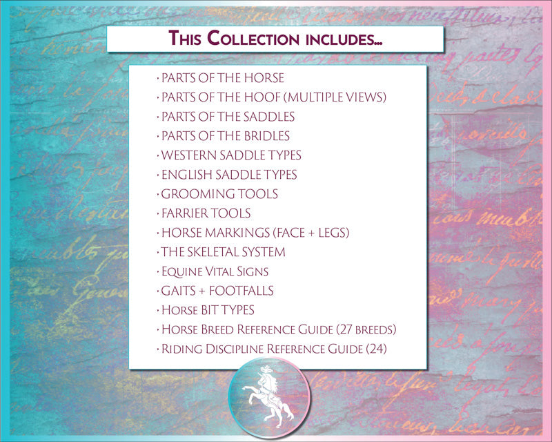 This digital collection was designed for equestrian students and hippology enthusiasts to learn foundational knowledge about horse care, tack, and being an equestrian! Easy to read diagrams will help you or your students learn horse parts, tack parts, and much more.