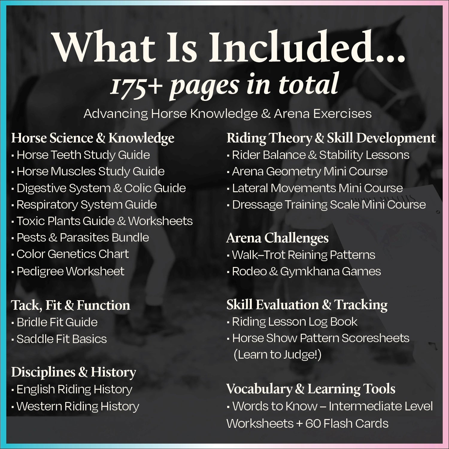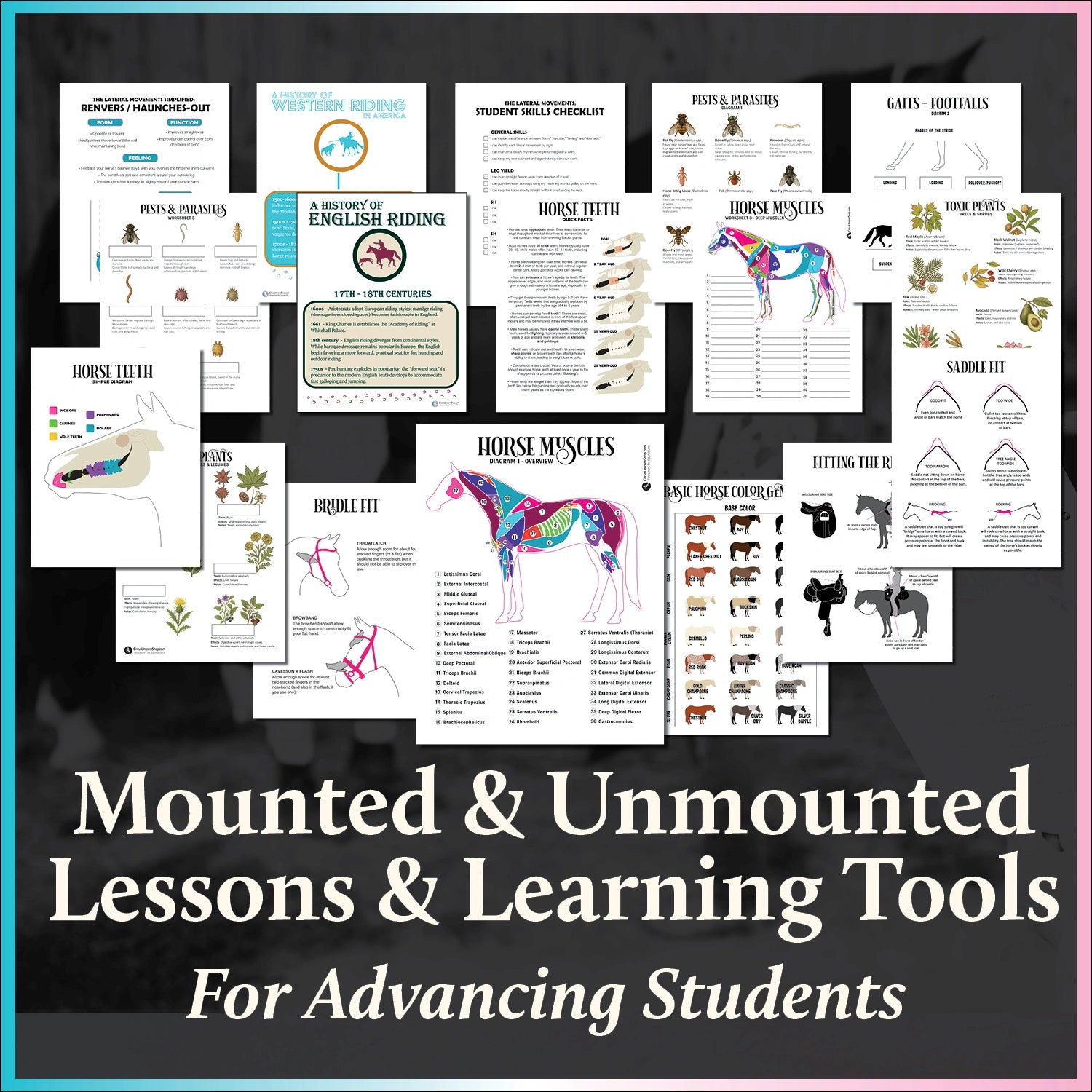 This collection is ideal for advancing students, serious riders, lesson programs, instructors, and homeschool families who want lesson material that is educational, visually engaging, and practical inside the barn and the classroom.