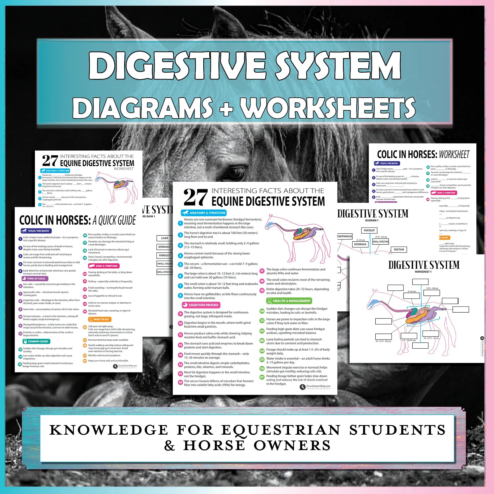 Equine Digestive System Printable Bundle | Equestrian Worksheets & Diagrams | Horse Safety and Colic Quick Facts for Riding Students and Instructors