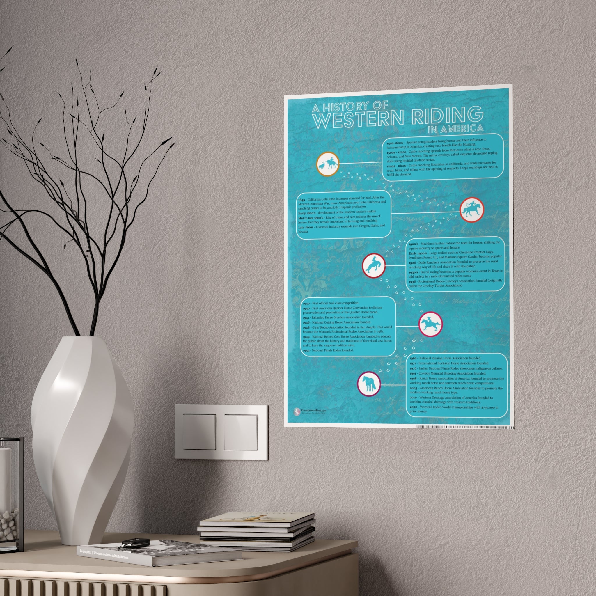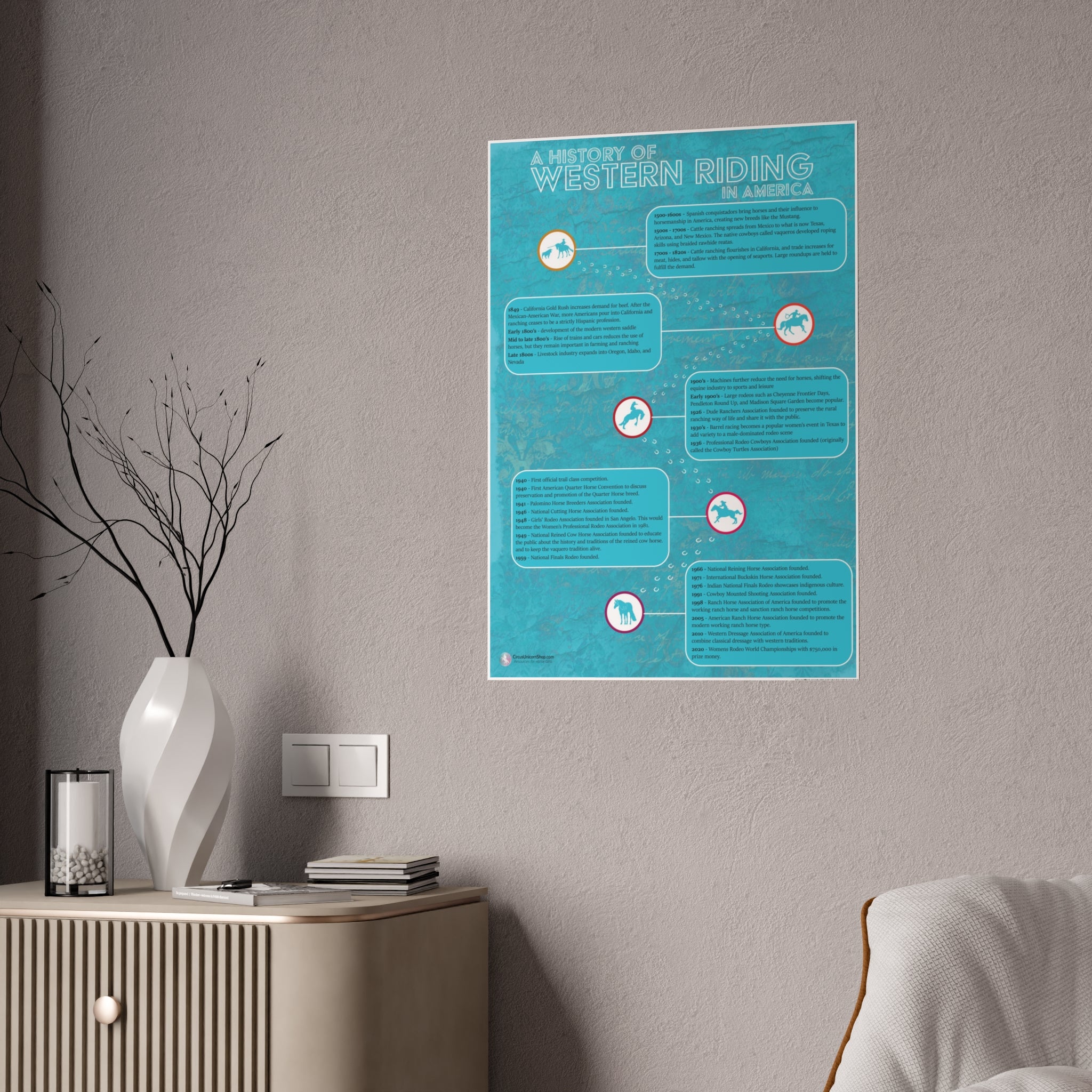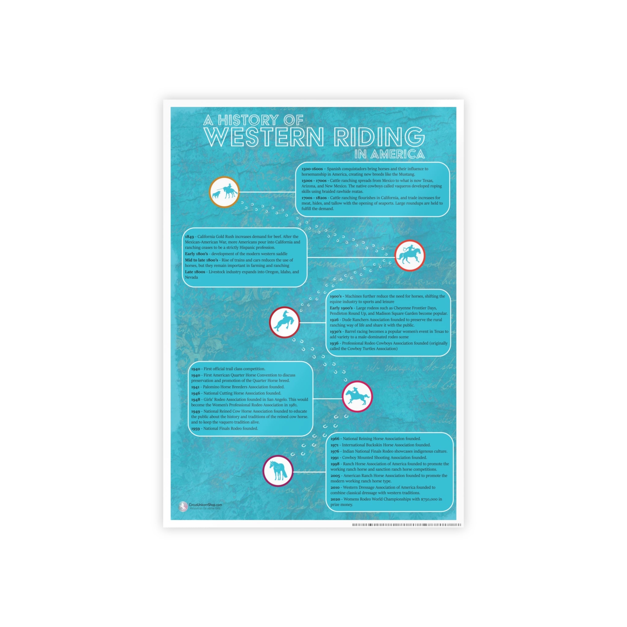 This equestrian poster is a wonderful wall-hanger for your barn, arena, or office! It also makes a great gift for horseback riding students, horse crazy kids, and horse owners! Includes a timeline of western riding from the Spanish conquistadors, through the height of ranching, to modern day rodeo and western horse competitions.