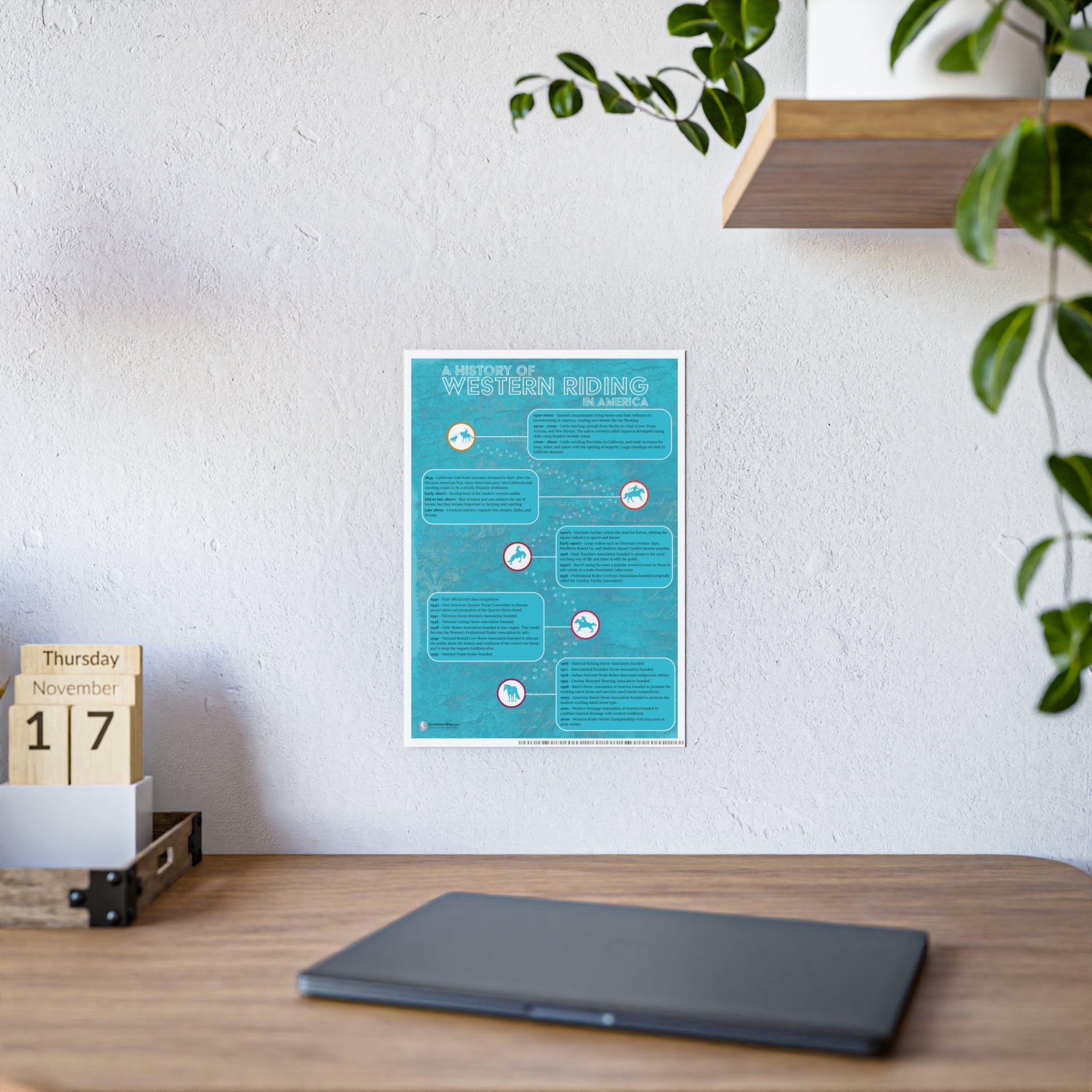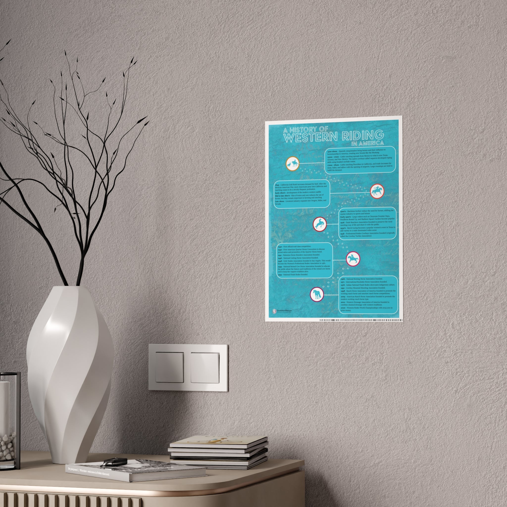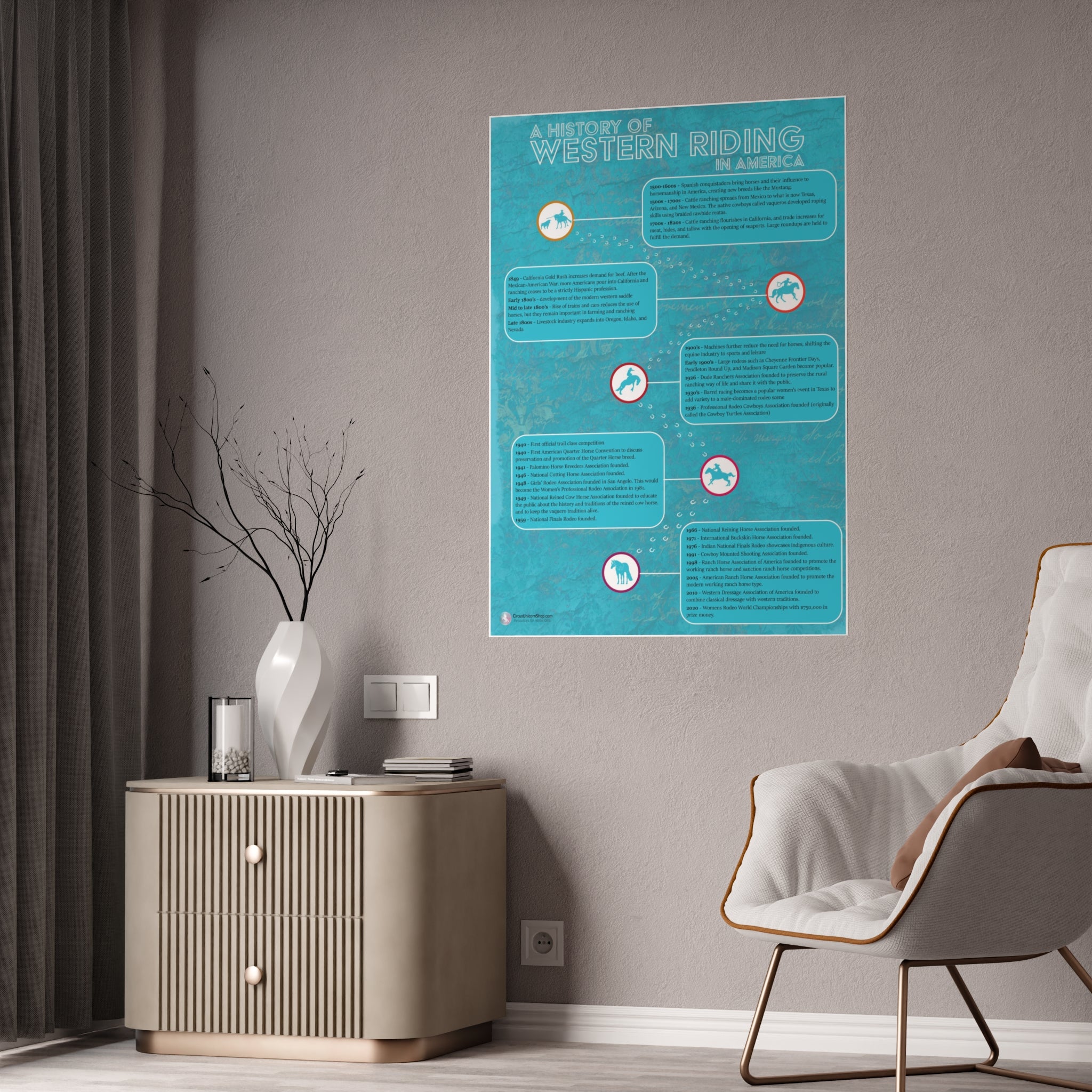 This equestrian poster is a wonderful wall-hanger for your barn, arena, or office! It also makes a great gift for horseback riding students, horse crazy kids, and horse owners! Includes a timeline of western riding from the Spanish conquistadors, through the height of ranching, to modern day rodeo and western horse competitions.