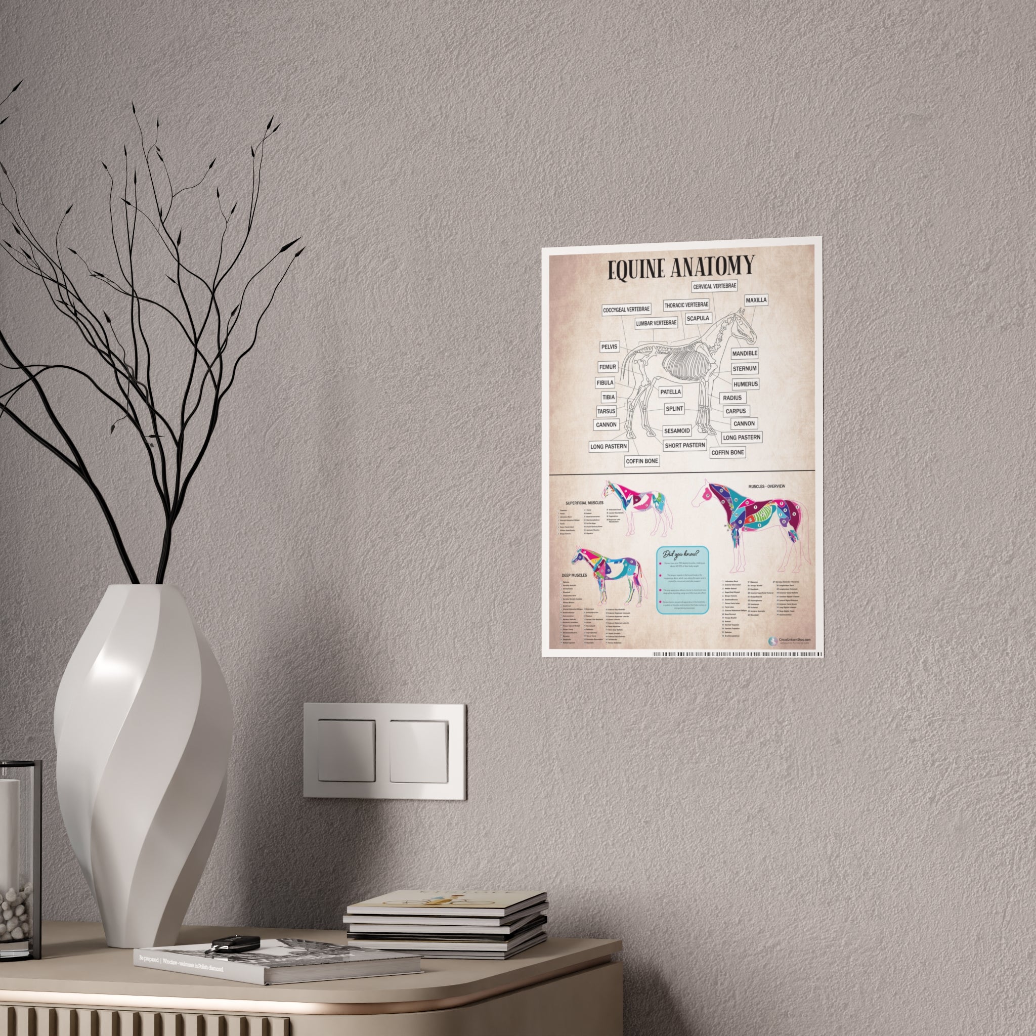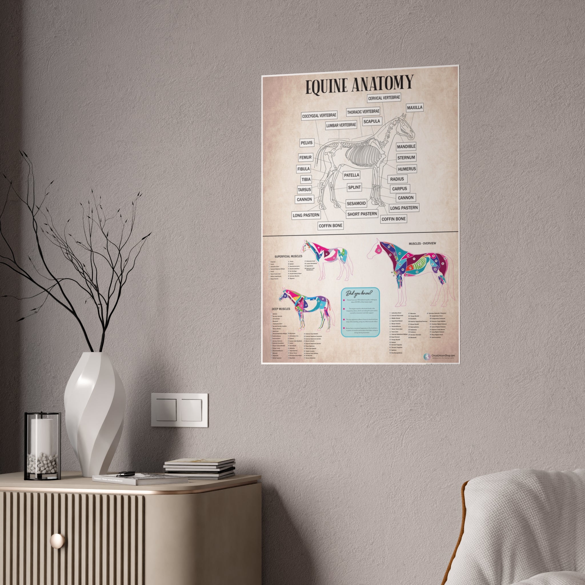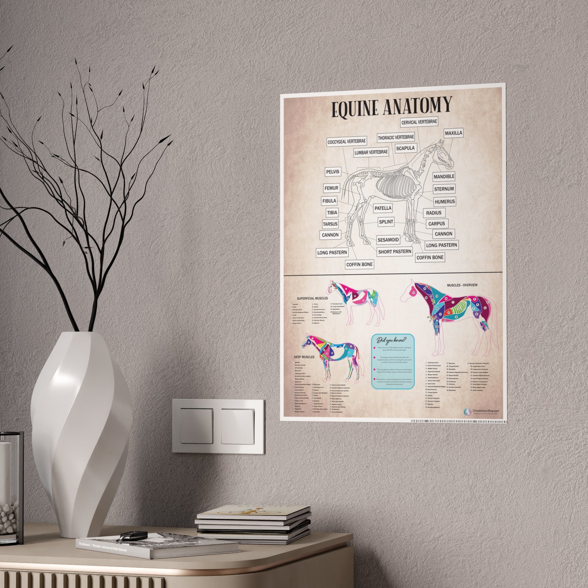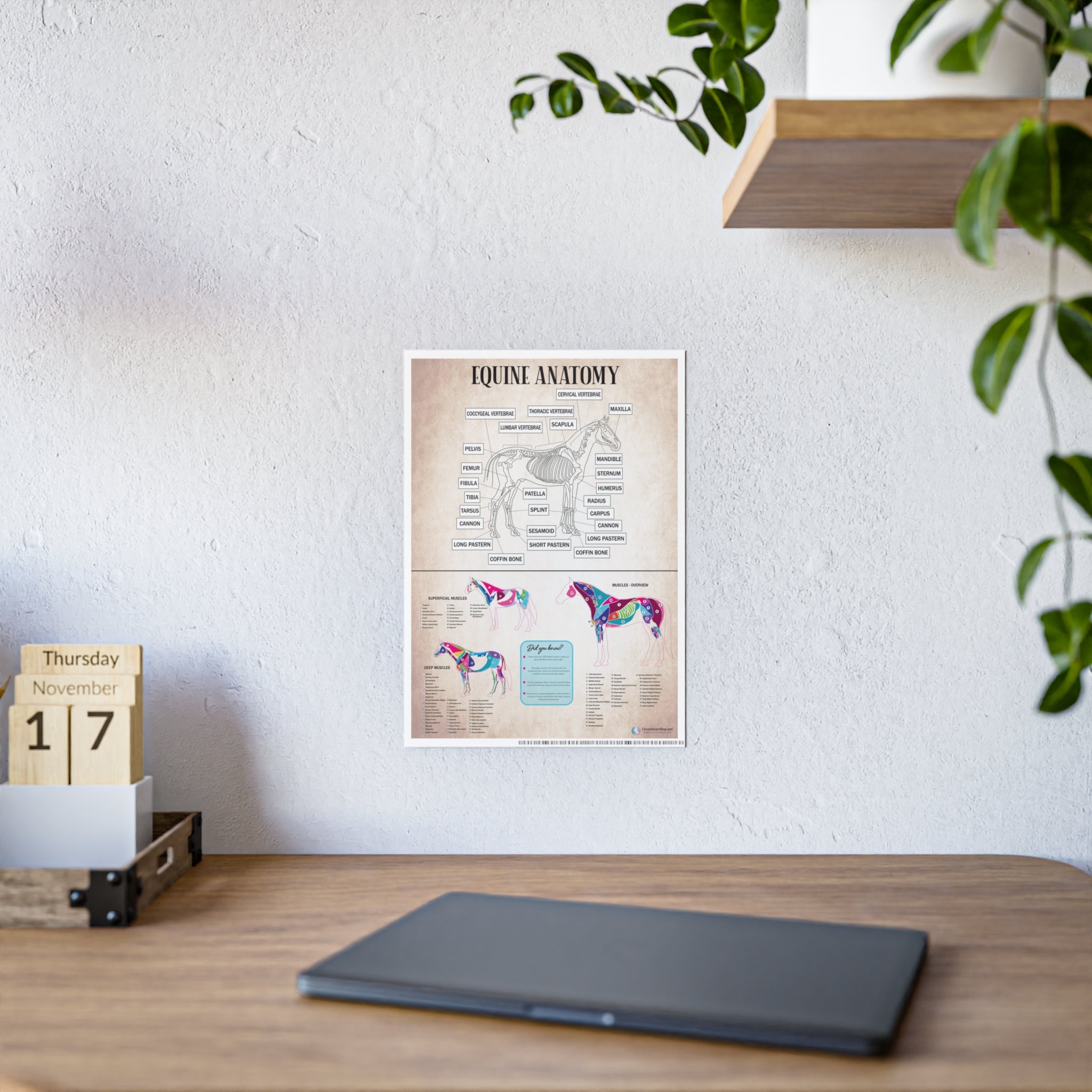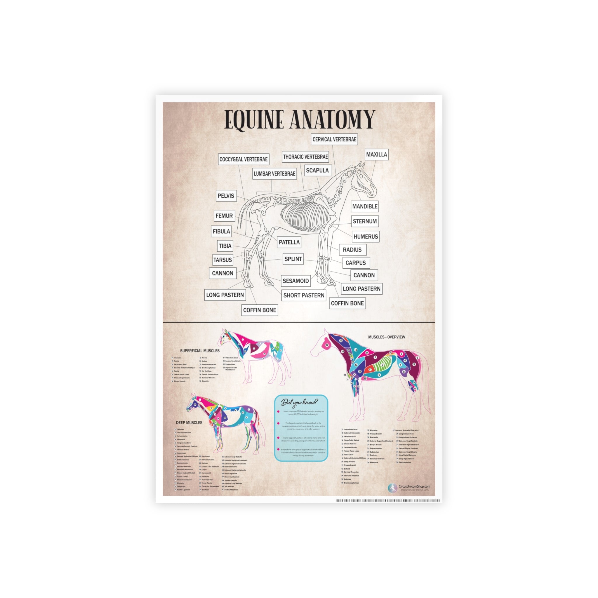 Includes horse skeleton and three diagrams for the muscles of the horse (overview, superficial, deep muscles).
