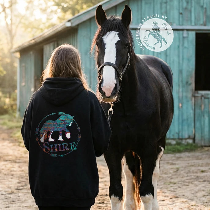 For chilly mornings in the barn, easy weekend rides, and cozy evenings at home, this Shire horse hoodie brings warmth and equestrian spirit together in one classic piece. Featuring a striking design of the beloved Shire horse, it celebrates power, beauty, and the quiet grace that makes this breed so special.