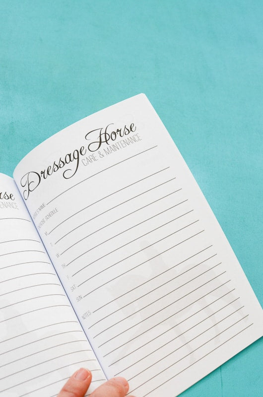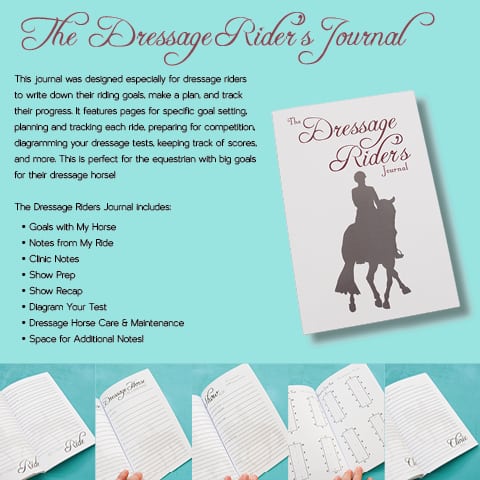 This dressage journal was designed especially for dressage riders to write down their riding goals, make a plan, and track their progress. It features pages for specific goal setting, planning and tracking each ride, preparing for competition, diagramming your dressage tests, keeping track of scores, and more. This is perfect for the equestrian with big goals for their dressage horse!