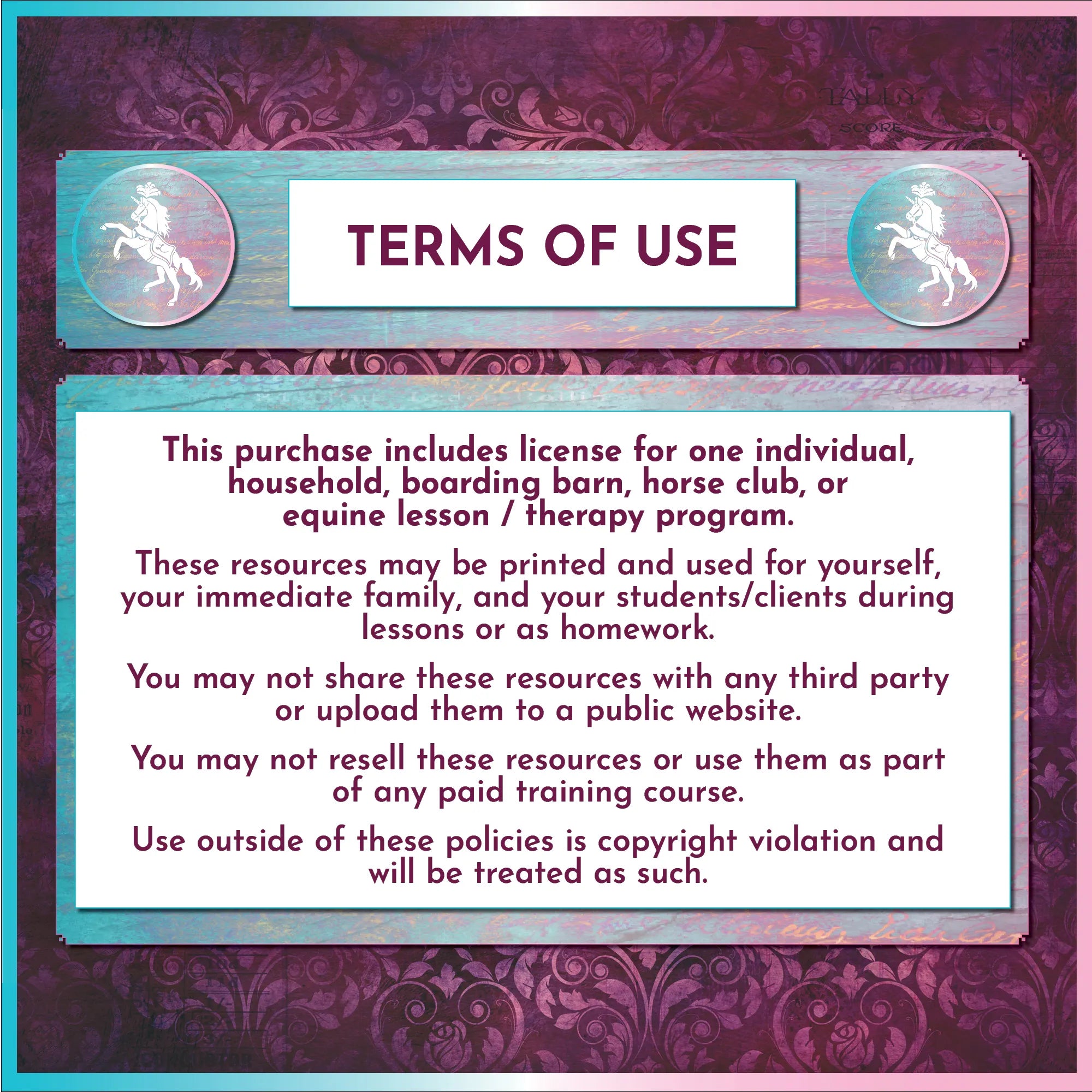 This purchase includes license for one individual, household, boarding barn, horse club, or equine lesson / therapy program.
