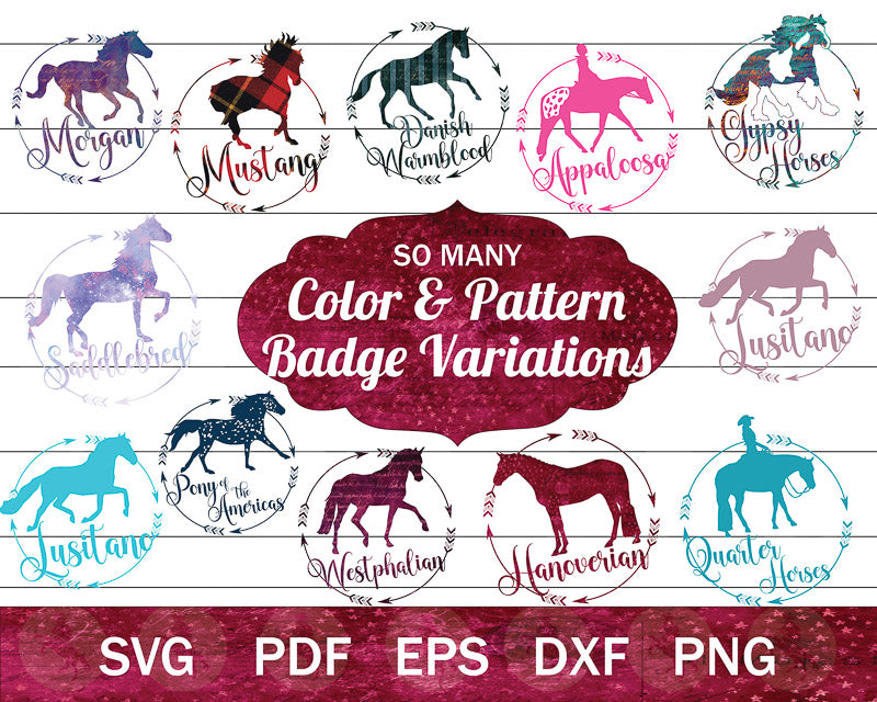 The Mega Horse Breed SVG & PNG Graphic Bundle includes more than 500 files of horse silhouettes, horse breed badge cut files, and PNG colorful and patterned badges. Make custom equestrian gifts for your horse owner friends!