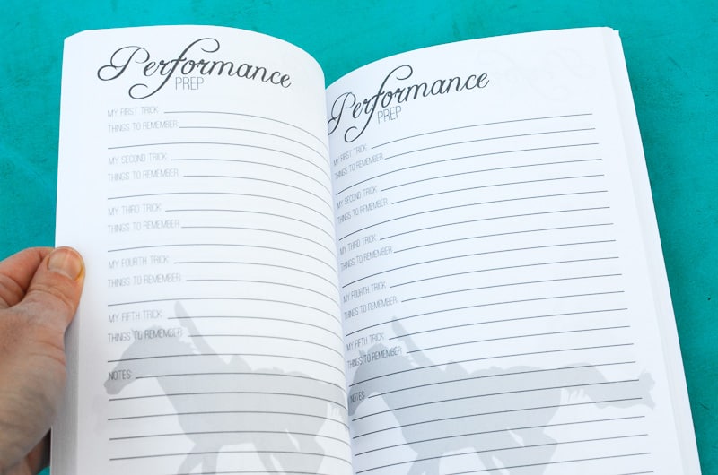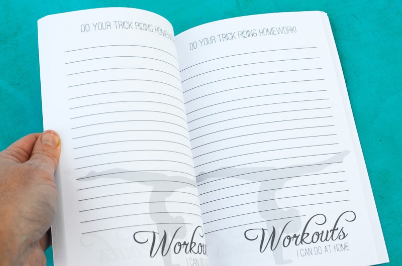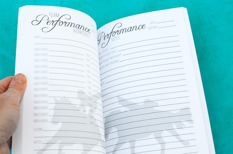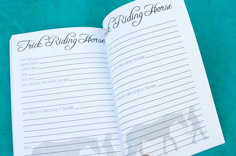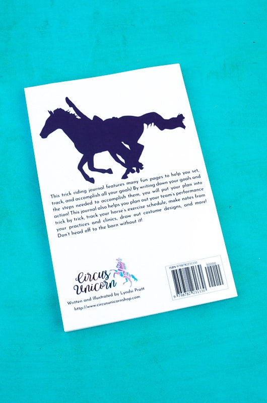 This trick riding log book features many fun pages to help you set, track and accomplish all your goals! By writing down your goals and the steps needed to accomplish them, you will put your plan into action! This journal also helps you plan out your team's performance trick by trick, track your horse's exercise schedule, make notes from your practices and clinics, draw out costume designs, and more! Don't head off to the barn without it!