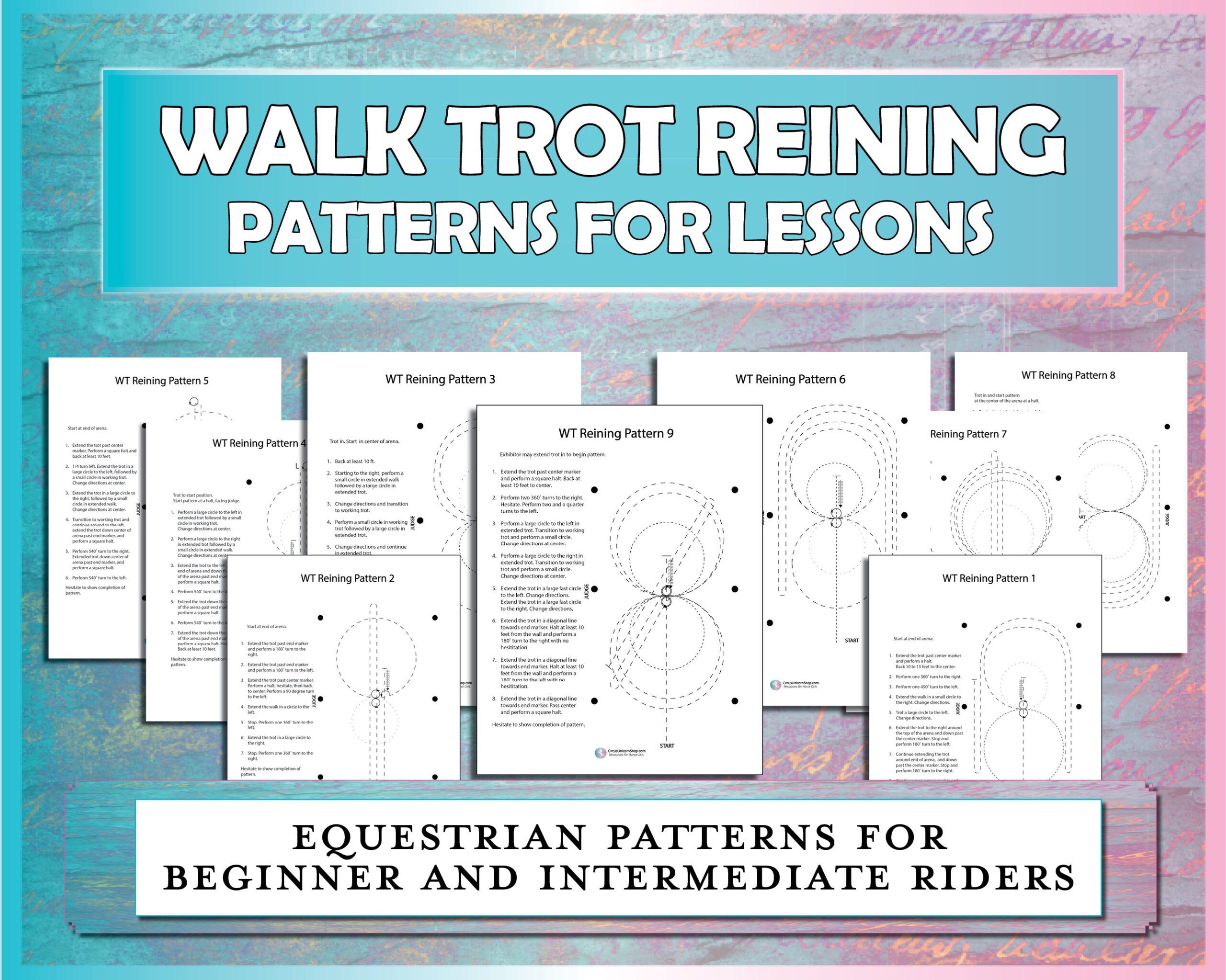 This bundle includes 9 reining patterns for beginner and intermediate students. Skills include working and extended walk and trot, square halts, pivots, various circle sizes, transitions, and back ups. These are so helpful for teaching students how to read horse show patterns.